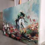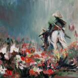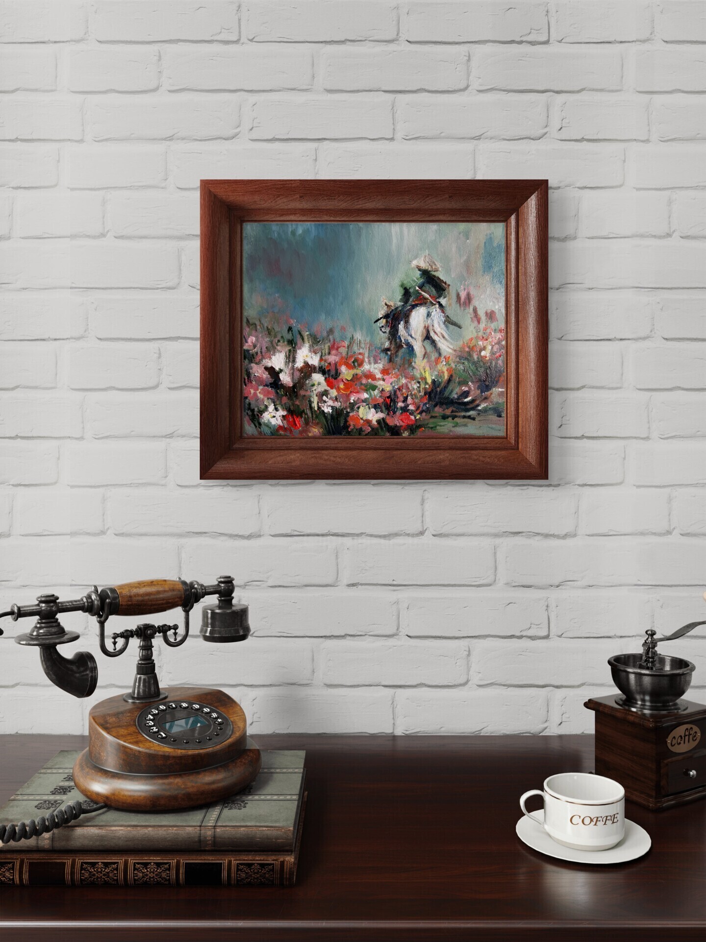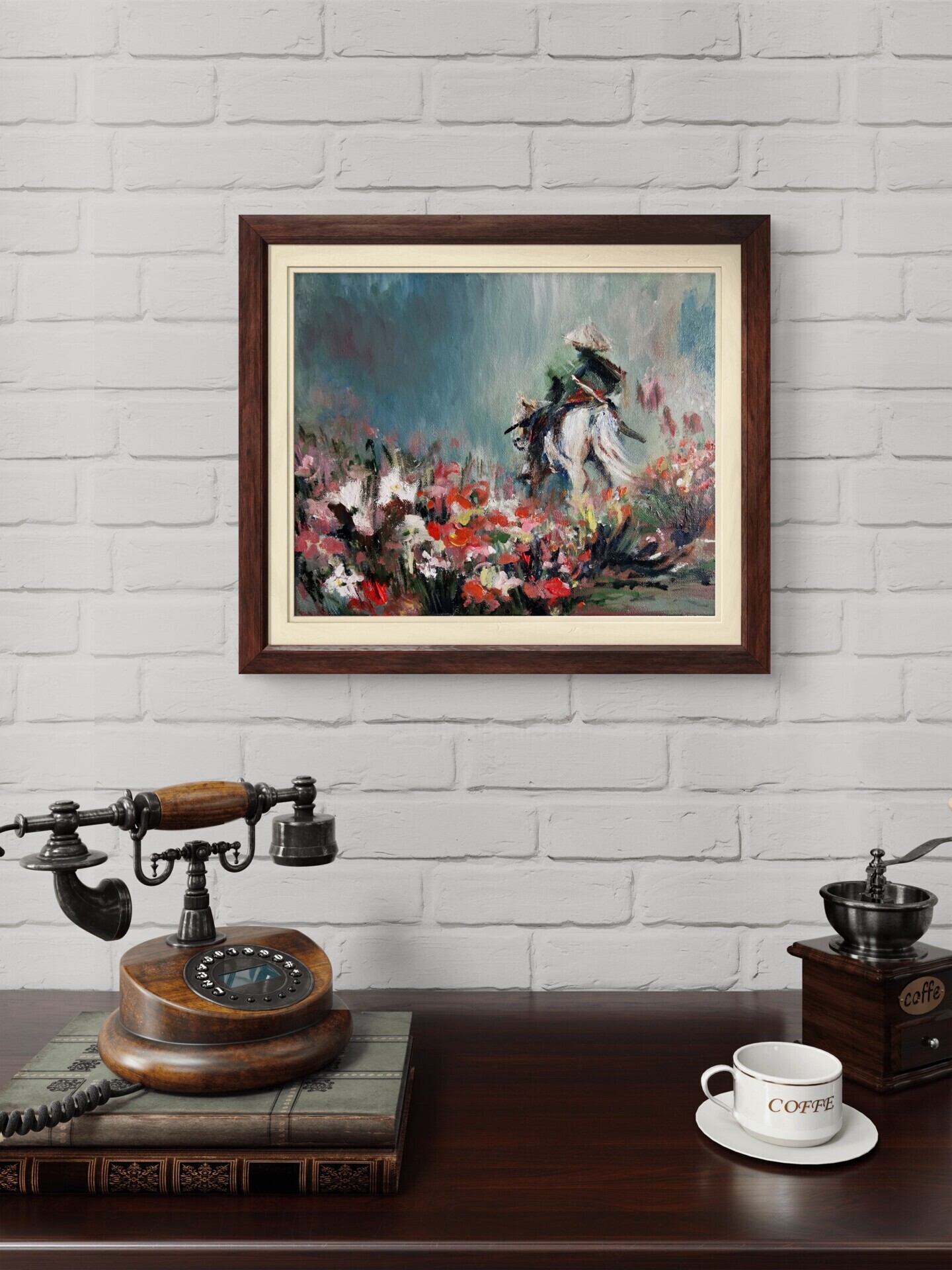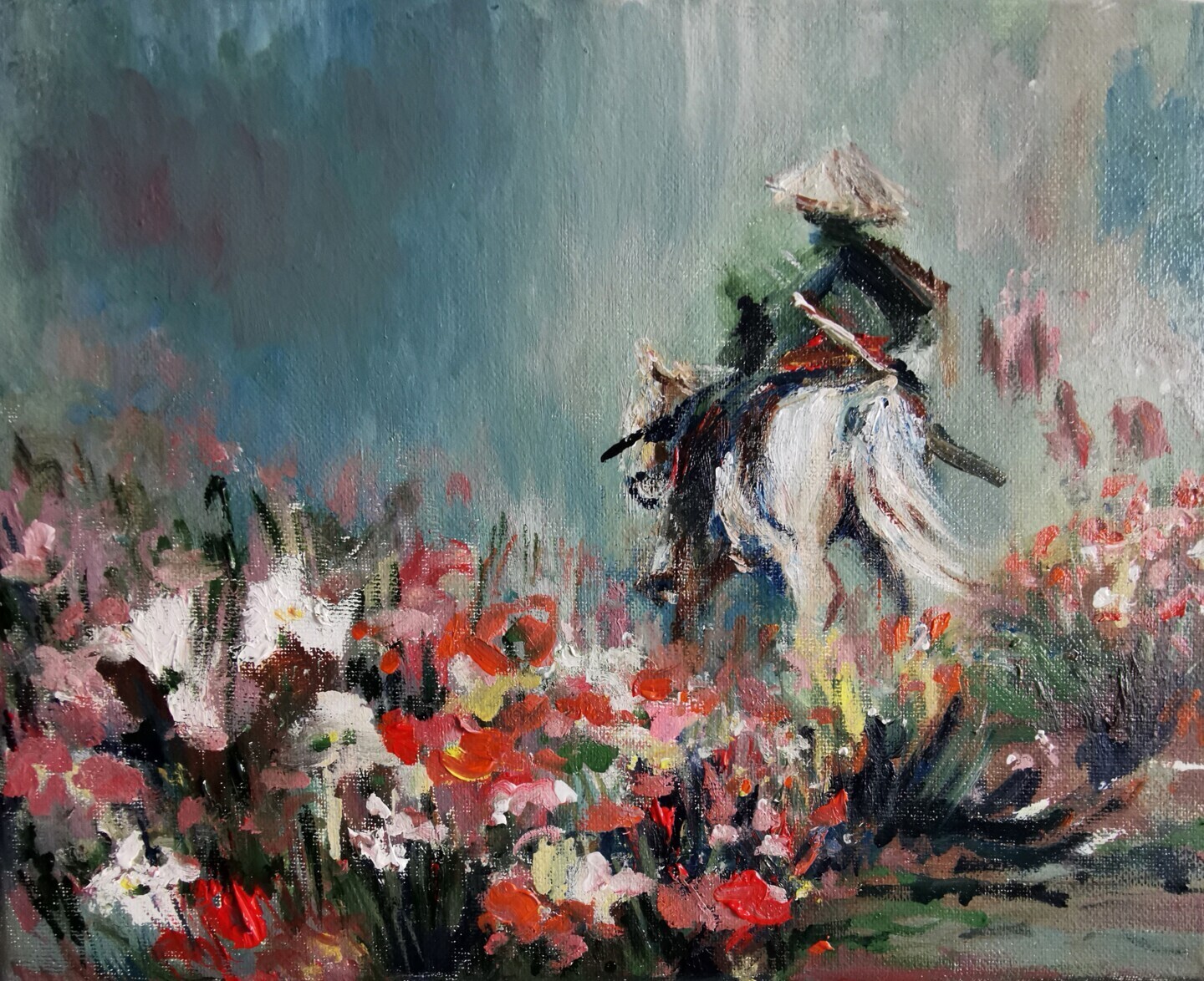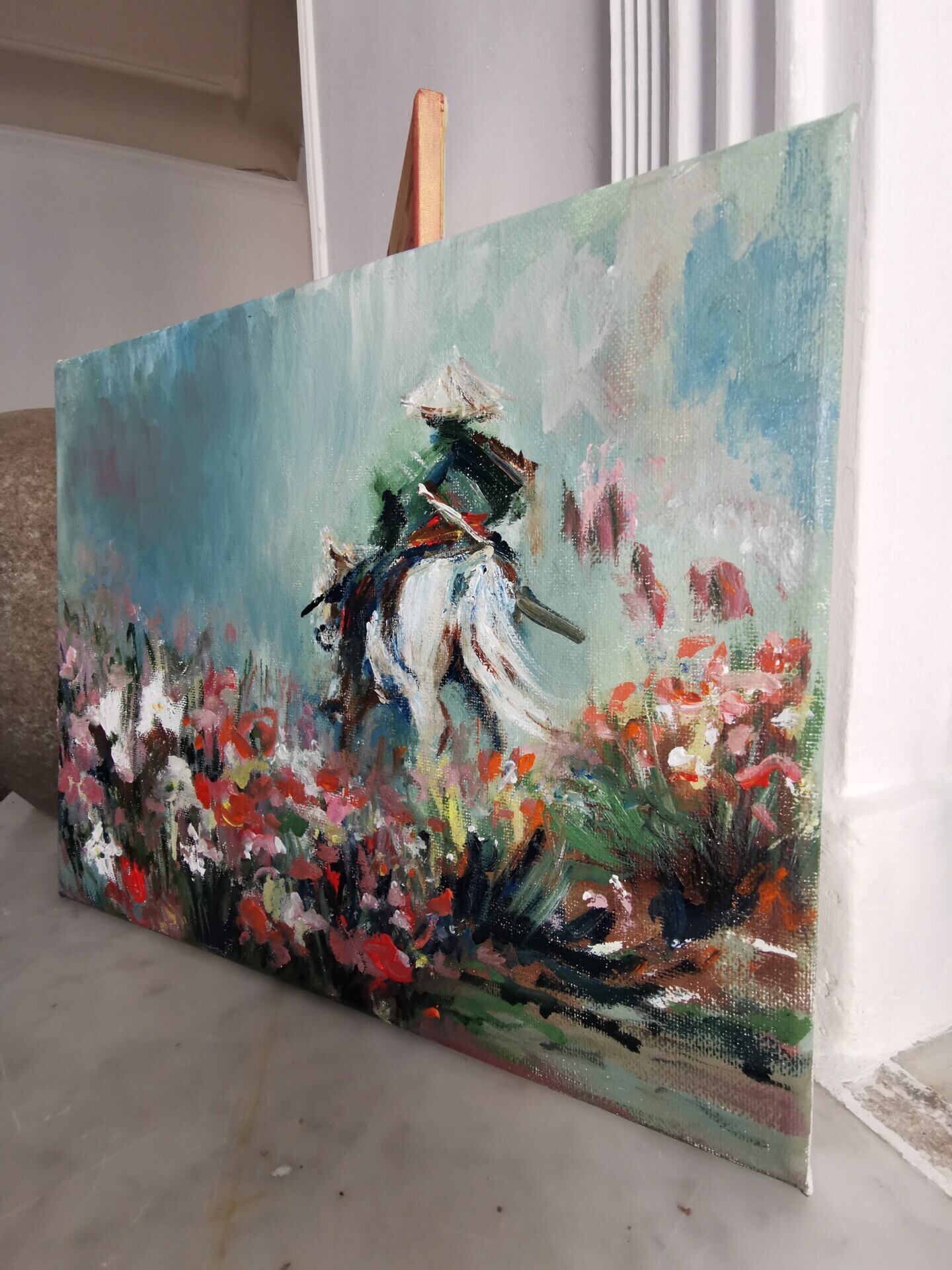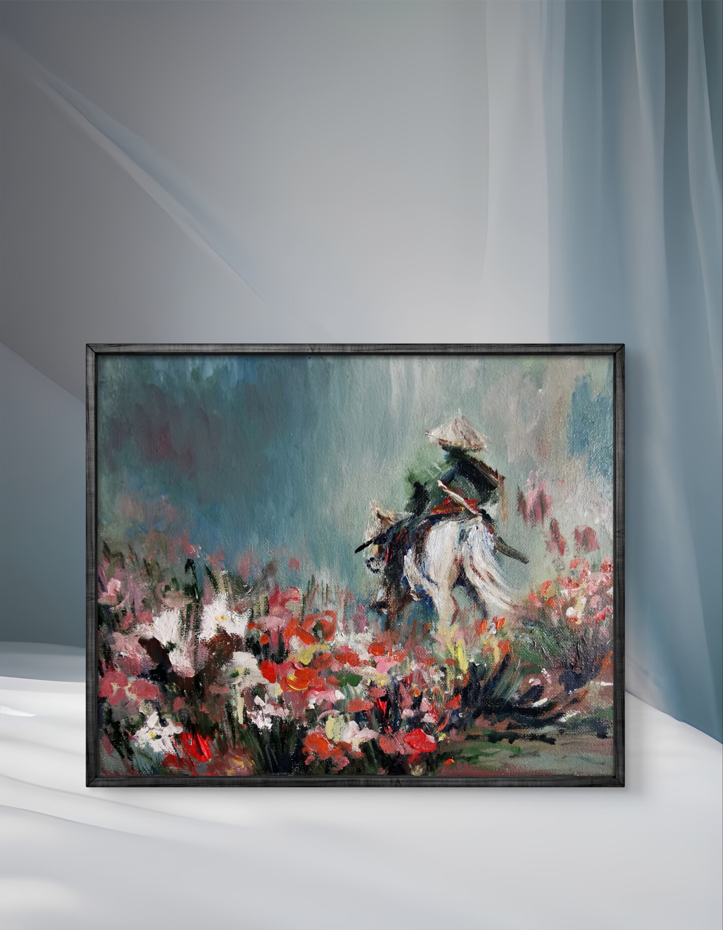 “Dreamy Horse Rider” is a poetic oil painting by contemporary artist Aloosan, part of the new series Echoes of the Shōka Path. This work captures the quiet retreat of a lone rider on horseback, entering a dreamy, flower-filled field. Illuminated by soft, mystical light, white blooms seem to glow — guiding the viewer toward a symbolic passage.