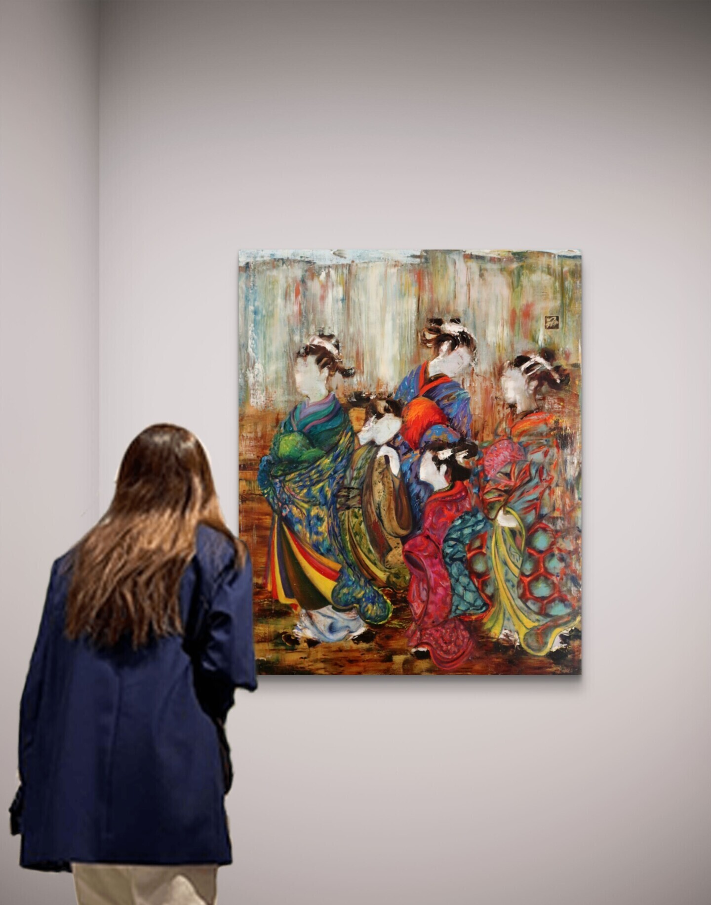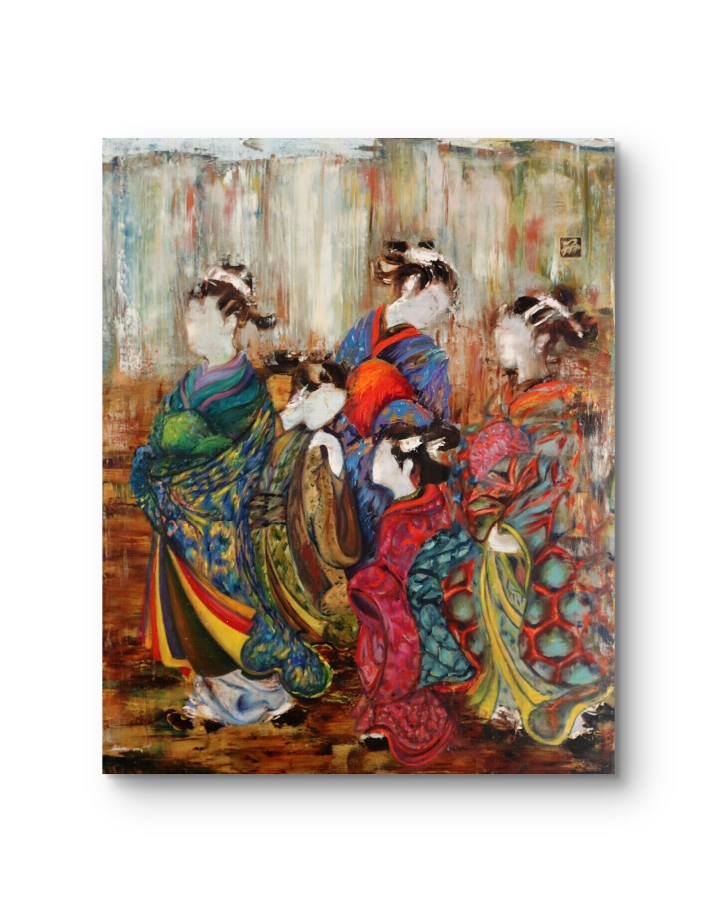 Ici, plusieurs jeunes geishas et maikos se rassemblent dans un silence doux, en attente de leur tour pour entrer dans l’eau purificatrice. Leur présence semble flottante — entre le mouvement et l’immobilité, comme un souffle retenu avant la transformation.