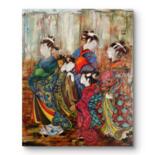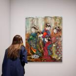 The painting belongs to the Floating Realm series, where transitions, thresholds, and delicate shifts of light are more important than narrative itself. Here, the passage between states becomes visible: the calm anticipation, the inner preparation, the quiet unity of women sharing a sacred pause.